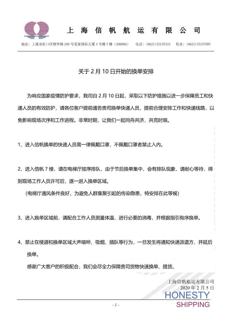 关于“信帆关于2月10日开始的换单安排”通知